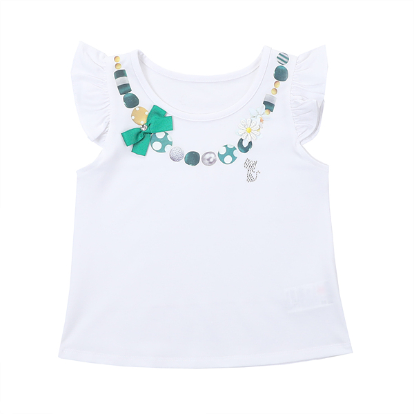 상품설명 화이트 컬러에 목걸이 전사나염이 찍혀있는 티셔츠 입니다. 전사 나염위에 리본과, 꽃모티브 장식이 큐트함을 더했습니다. 어떠한 하의와도 코디하시기 좋습니다.