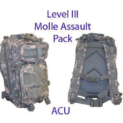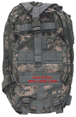 Made From 600D Polyester Material - P.P. Webbing Rugged Synthetic Material Similar To Rigid Government Specifications. Accepts Modular or Alice Pack Components MOLLE Compatible. Heavy Duty Zippers with Pull Tabs. Polyurethane Coated Lining Pockets. Water Resistant Material. Padded Back With Breathable Mesh Backing. Adjustable Padded Shoulder Straps. Adjustable Removable Waist Belt. Top Carry Handle. Hydration Bladder Compatible. Size : 18"H x 10"W x 10"D 0
