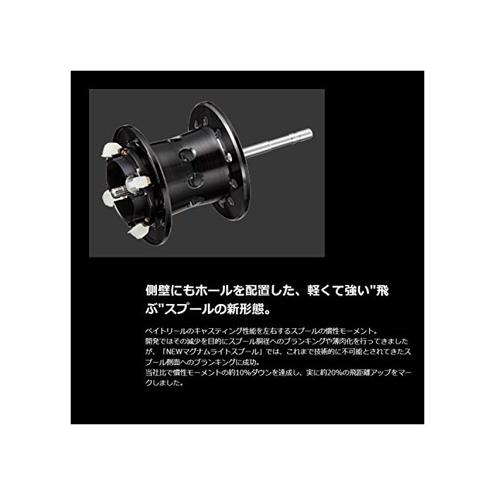 [매그넘 라이트 스풀]측벽으로도 홀을 배치했다, 가벼워 강하다「난다」스풀의 신형태.:베이트 릴의 캐스팅 성능을 좌우 하는 스풀의 관성 모멘트.개발로는 그 감소를 목적으로 스풀동 지름에의 blanking나 박고기화를 행하게 되었지만,「NEW매그넘 라이트 스풀」그러면,지금까지 기술 적으로 불가능과 되고 온 스풀 측면에의 구멍 열게 성공.당사비에 관성 모멘트의 약10%다운을 달성하고, 참으로 약20%의 비거리 업을 마크 했습니다.