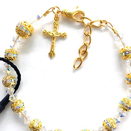 -. Binding : Jewelry -. Brand : Rana Jabero -. Color : Gold -. Department : womens -. Feature : Genuine Swarovski® crystals were used to create this beautiful Rosary bracelet, along with gold plated findings. / Beautiful bracelet features 10 Hail Mary beads and 1 Our Father bead, along with a small plated crucifix. / Authentic Rana Jabero® piece. Tag included with each item. Handcrafted in USA. / Gift box included with each item. Makes a great gift! / Measures 7.25" plus a 1" extender -. Label : Rana Jabero -. Manufacturer : Rana Jabero -. ProductGroup : Jewelry -. ProductTypeName : FASHIONNECKLACEBRACELETANKLET -. Publisher : Rana Jabero -. Studio : Rana Jabero -. Title : Swarovski Crystal Sparkling Rhinestone Rosary Bracelet Crucifix Cross Charm - Gold Plated
