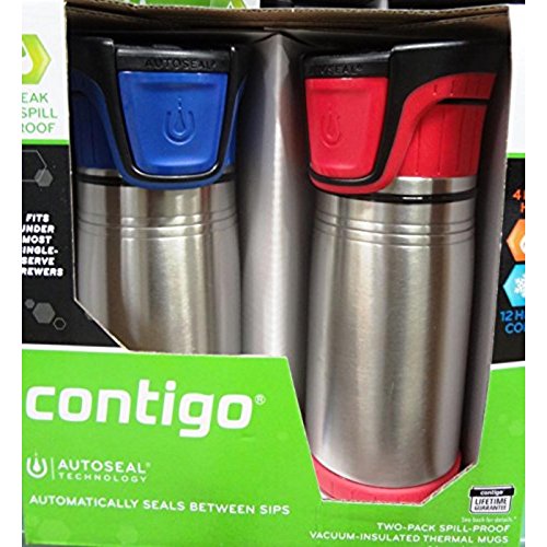 Contigo 2 Pack Spill proof Vacuum Insulated Thermal Mugs Dazzling Blue/Watermelon.Autoseal Technology:Automatically Seals Between Sips.4 Hours Hot, 12 Hours Cold.Spill Proof and Leak Proof.Contains 2-16 OZ Mugs.