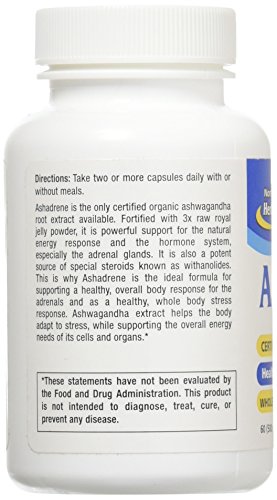 Ashadrene is the only certified organic ashwagandha root extract available. Potent to the extreme, it provides powerful support for healthy adrenal gland function, while also combating stress. Fortified with triple strength, undiluted royal jelly, it's ideal for supporting the natural coping mechanism. The main arena of ashwagandha's actions is to boost energy and a healthy anti-stress response. Both ashwagandha and royal jelly are rich in biologically active sterols, the root resin containing anolides, which support a healthy anti-inflammatory response, while also blocking excessive blood vessel formation, known as an anti-angiogenesis response.Feature