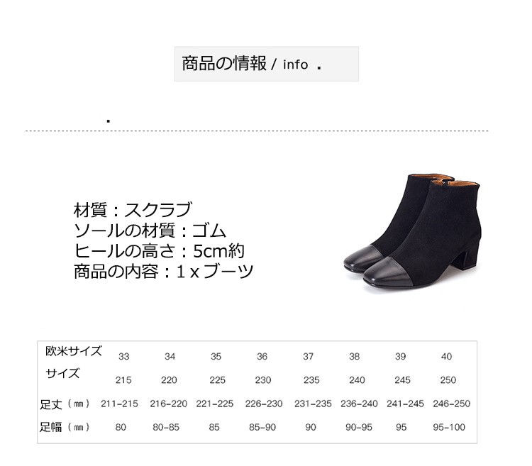 材質:スクラブソールの材質:ゴムヒールの高さ:5cm約商品の内容:1xブーツサイズ:22~24.5cm約サイズ:34:22cm 35:22.5cm 36:23cm 37:23.5cm 38:24cm 39:24.5cm 40:25cmショートブーツレディース ヒール 女性のアンクルブーツ シューズ ファスナー式靴 秋冬物 シンプル くつレディース用のアンクルブーツが登場ハイヒールの靴なので、美脚です安定感があって歩きやすいからお出かけにもオススメカラーもシルエットもとても組み合わせしやすくて、どんな場合にも使える上品な一足