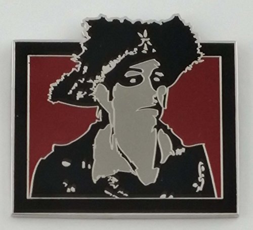 - This pin features a pirate in black and white silhouette like form in a black square frame. Behind the pirate is a red background