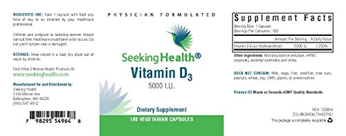-. Binding : Health and Beauty -. Brand : Seeking Health -. EAN : 0798295549648 -. Feature : Provides 5,000 IU Vitamin D3 as cholecalciferol per capsule. / IMPORTANT: Vitamin D3 5000 IU is manufactured for and sold exclusively by Seeking Health on Amazon.com. We DO NOT recommend purchasing this product from any supplier other than Seeking Health on Amazon. / Free of Common Allergens. Suitable for vegetarians. / Does Not Contain: Milk, eggs, fish, shellfish, tree nuts, peanuts, wheat, soy, artificial flavors, colors or preservatives. / Physician Formulated. -. IsAdultProduct : 0 -. Label : Seeking Health -. Manufacturer : Seeking Health -. MPN : VITAD-100-CAPS -. PartNumber : VITAD-100-CAPS -. ProductGroup : Health and Beauty -. ProductTypeName : HEALTH_PERSONAL_CARE -. Publisher : Seeking Health -. Studio : Seeking Health -. Title : Vitamin D3 5000 IU | High-Potency Vitamin D3 Supplement | 100 Vegetarian Capsules | Seeking Health -. UPC : 798295549648