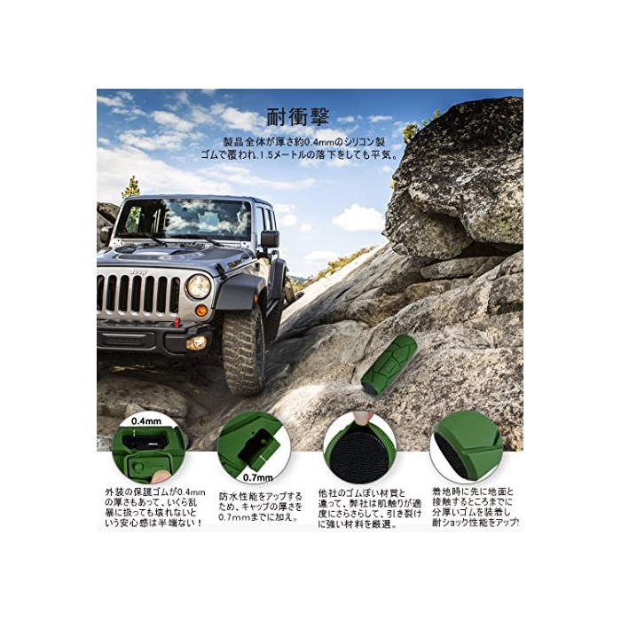 【방수 방진내 충격】IP44의 방수 방진 인증을 취득.제품 전체가 약두께0.4mm의 실리콘제 고무에 덮히고, 1.5미터의 낙하를 해도 태연.아웃도어나 목욕탕의 사용에 최적인 방수 스피커를 부디 시험해 주세요.