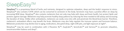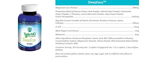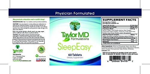 -. Binding : Health and Beauty -. EAN : 0608866849872 -. Feature : NATURAL SUPPLEMENT: Perfect blend of herbs and nutrients, which may optimize relaxation, sleep and the body's response to stress. It also contains 5-HTP, which can be converted to serotonin in the body. / NATURAL SLEEP: After more than 5 years of researching and improving, we have combined the most effective natural sleep support nutrients known. Most Potent Insomnia Relief Supplement Out There / NON-HABIT FORMING: SleepEasy is non- addictive supplement. ★ No Artifical Colors ★ No Preservatives. Unlike prescription sleep drugs and other supplements on Amazon. Buy your 60 day supply of SleepEsy today and experience the boundless energy and unlimited potential that comes with every night of deep, quality sleep. / SUPPORT BRAIN: SleepEasyTM also contains melatonin that not only may help with sleep and brain health, but protect lipids and proteins against damage. Melatonin can help promote healthy sleep patterns by reducing the time needed to fall asleep and increasing the duration of sleep. -. Label : Taylor MD Formulations -. LegalDisclaimer : These statements have not been evaluated by the Food and Drug Administration. These products are not intended to diagnose, treat, cure or prevent any disease. -. Manufacturer : Taylor MD Formulations -. PackageQuantity : 60 -. ProductGroup : Health and Beauty -. ProductTypeName : HEALTH_PERSONAL_CARE -. Publisher : Taylor MD Formulations -. Size : 60 Capsules -. Studio : Taylor MD Formulations -. Title : SleepEasy TM - Insomnia & Stress Relief Supplement - Fast Sleep - Herbal Sleeping Pill - Contains 5-HTP, Vitamins, Herbs & Nutrients - Relaxation Optimization - Dietary Supplement - Side Effect Free - Physician Formulated & Clinically Tested - Guaranteed by Taylor MD Formulations -. UPC : 608866849872
