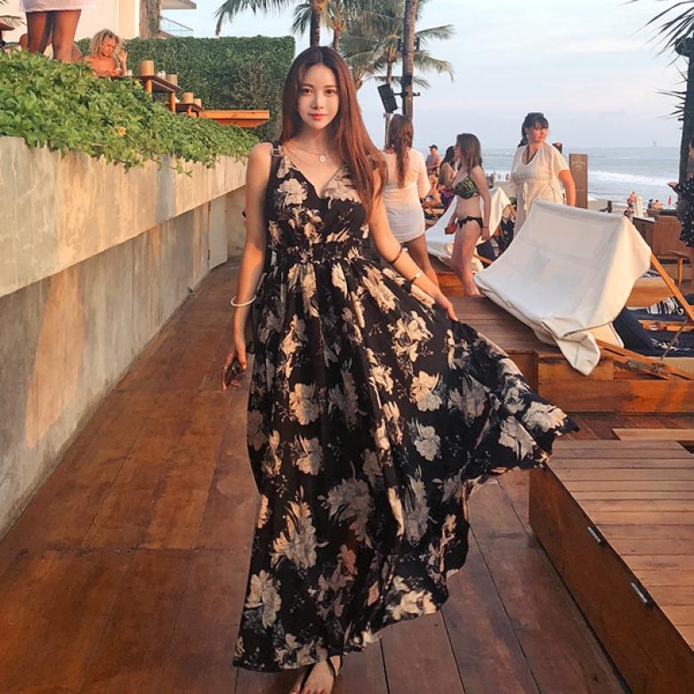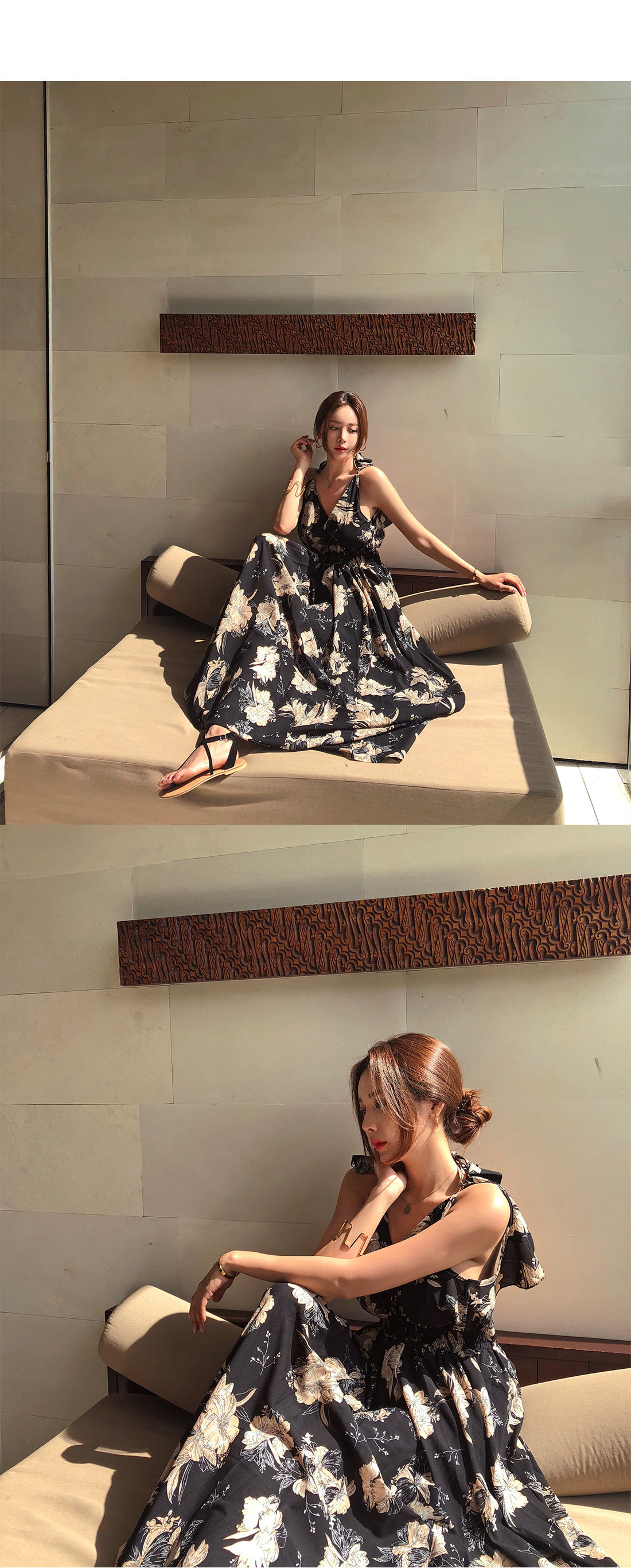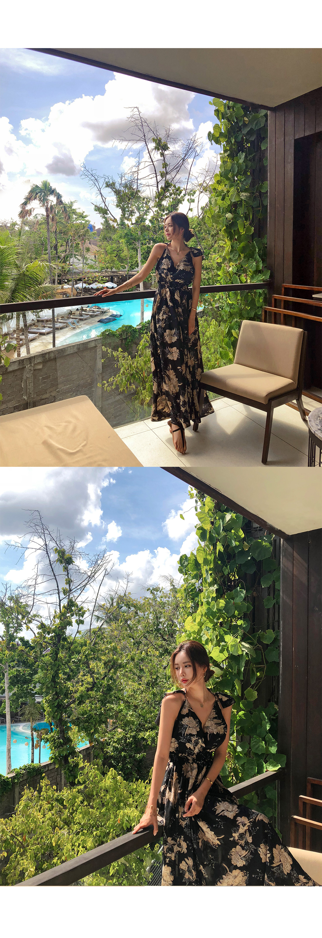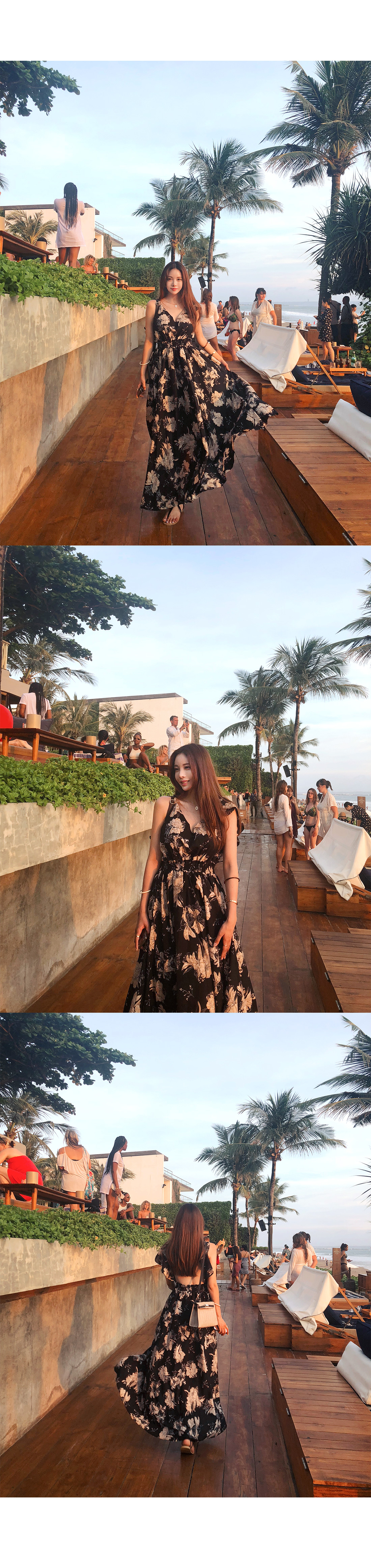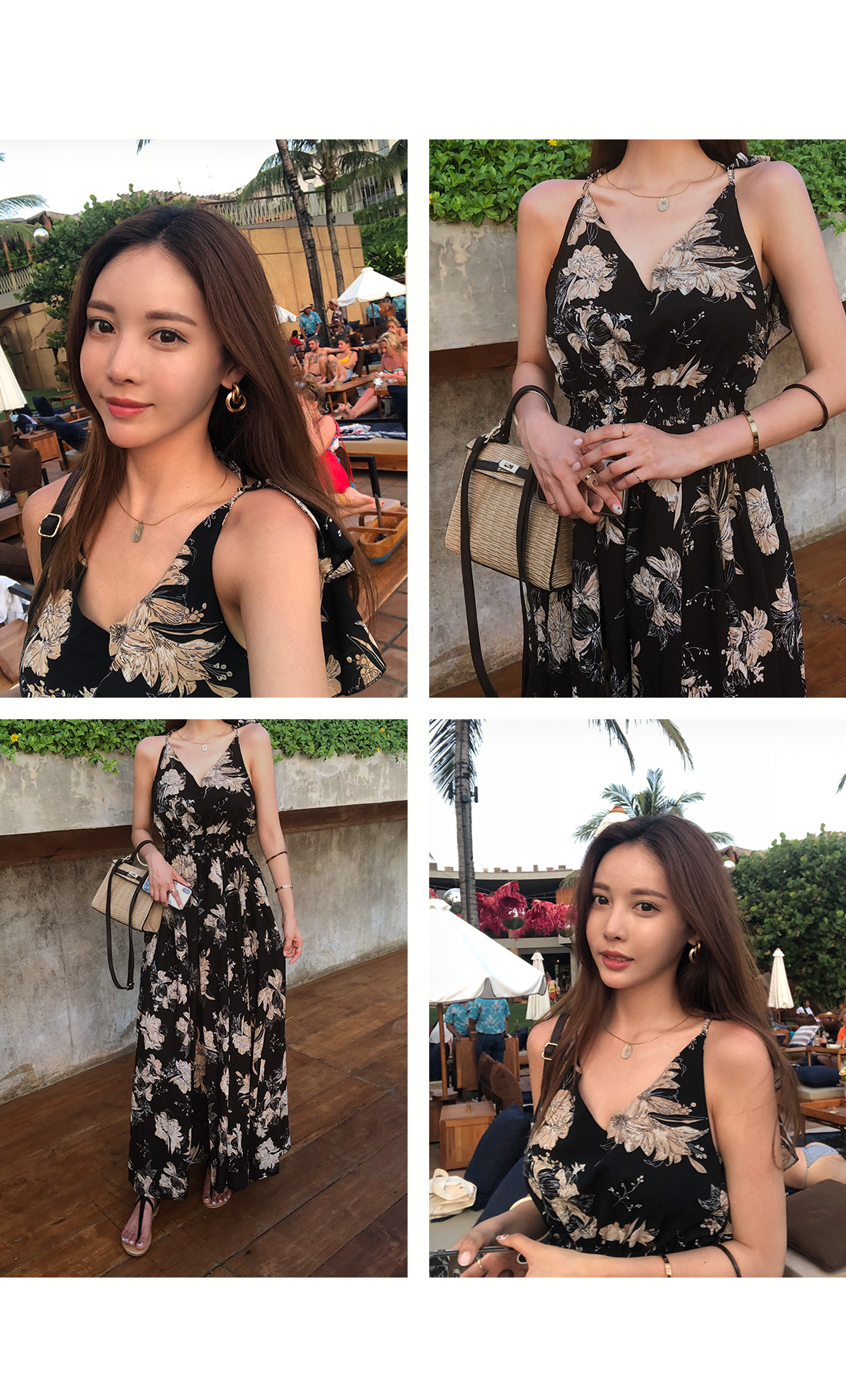 로맨틱한 플라워 패턴으로 룩에 포인트를 더해 주었으며 여성스러움이 물씬 풍기는 원피스 아이템이에요.