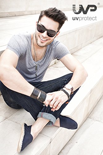 Alle Sonnenbrillen sind CE zertifiziert, gepruft nach DIN EN ISO 12312-1:2013 und garantieren Schutz vor UVA- und UVB Strahlen im Sinne des UV 400 Schutzes. Die Schutzeigenschaften entsprechen der Kategorie 3 (sehr dunkler Filter, gut geeignet fur sudliche Gefilde, helle Wasserflachen, den Strand und die Berge). Abmessungen: Bugellange: 140mm, Glaserhohe: 43mm, Glaserbreite: 53mm, Steglange: 21mm, Gesamtbreite: 145mm.