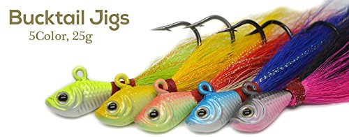 -. Feature : Lead fish head with 3D big eye / Luminous lead head, glow in water / 25g 1oz,weight and five colors; / Bucktail Jig 5pcs mixed random colors in One Set / Great catcher for weakfish, fluke and other saltwater fishes