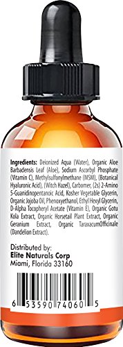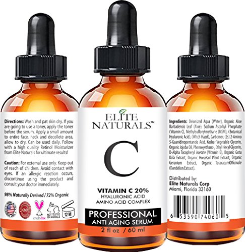 ELITE NATURALS HAS A SOLUTION FOR YOU!Our Vitamin C Serum 20% shields the skin from external irritants and helps prevent skin problems before they occur. Enjoy radiant, youthful skin again with our potent blend of ingredients, professionally formulated using the highest quality Hyaluronic Acid and Vitamins C and E. Vitamin C has been shown to be a very effective treatment of reversing the signs of aging and shows its effects of time and environmental damage to the skin. As the Vitamin C serum penetrates deep into your skin, you can feel confident knowing you are reversing skin aging and preventing further damage at the same time. Notice brighter, smoother and beautiful skin!