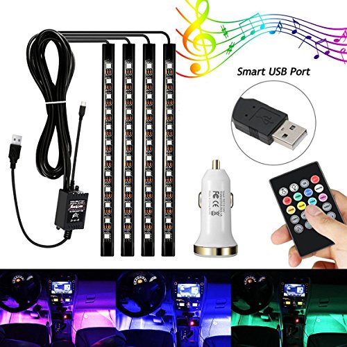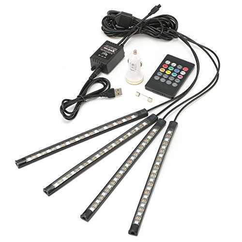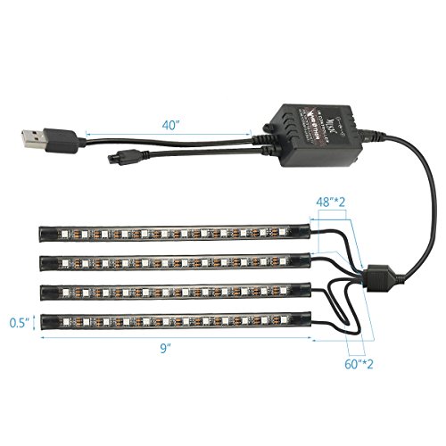 - ★(Pack of 4) Wireless music control 8 color RGB car interior footwell lights kits. LED: 4x 12leds, LED type: 5050-SMD, LED Light Length: 9"; Width: 0.5", Strip light Cable Length:2*48" + 2*60", Car USB Charger Cable Length: 40", Extend Wire Length: 12".