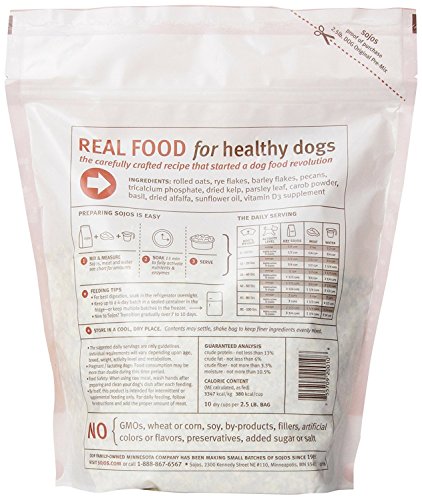 This bag of ready-to-mix food just needs meat and water to make it a complete, healthy, and delicious meal for your pet. One 2.5 lb bag makes up to 12 lbs of food after being mixed. Sojo's raw made easy food is baked in small batches to assure quality and flavor, and uses only all-natural premium ingredients. The food is wheat-free, corn-free, and gmo-free. It allows you the choice of which meat your pet loves best and is healthiest for them. The food is veterinarian recommended, so you know it's a great choice. If it says Sojos, you know it's prepared under our own roof, right here in the USA.Feature