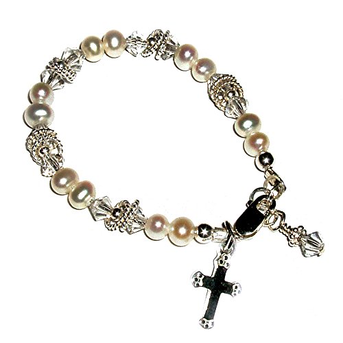 -. Feature : Luxury Keepsake Quality, Hand Strung in the USA / Sterling Silver, Cultured Pearls, Swarovski Crystals, and Dainty Cross Charm / Each bracelet has adjustable sizing / Beaded on a Strong stainless-steel Wire, Safe and Durable for Children / Jewelry Comes in Beautiful Gift Box