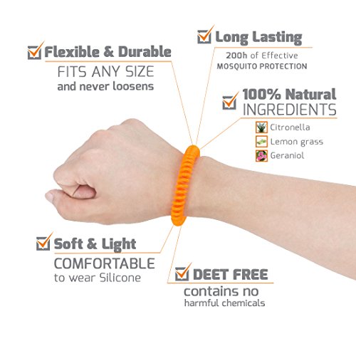 -. Feature : REPELS MOSQUITOES, BUGS & PESTS - You can't imagine anything being more annoying, than being constantly bitten by mosquitoes while you are spending some quality outdoor time with your loved ones? We can't either! Thats why we created the MosQuitO Bracelet, so you can enjoy the outdoors without worrying about these pesky little bers and their bug bites. / NON-TOXIC & DEET FREE - We understand you. You don't want to put all kinds of chemicals on your skin. Thats why we designed MosQuitO Repellent Bracelets with 100% all natural Ingredients. Citronella, Lemongrass and Geraniol are proven to deter bugs and pests better than any other insect repellent. And the best part? It's DEET free! / ADJUSTABLE & WATERPROOF DESIGN - Our silicone wristbands are ingeniously designed so they can be worn by both adults and children. Wear them anywhere you want, on your arm or ankle or just put them on your backpack or stroller. Want to take a swim? Don't worry, the bracelets are waterproof so you never have to be afraid about being not protected from those creepy crawlers. / LONG LASTING - Tired of conventional insect repellents lasting only for a few hours? Our bracelets are long lasting, the ingredients are released slowly and each bracelet provides effective protection for up to 200 hrs. We even deliver them to you in a resealable pouch that extends their usefulness. / USE EVERYWHERE - Want to use them anywhere you go? No problem! MosQuitO Repellent Bracelets are ideal for all kind of activities. Camping, sport events, fishing, grilling, gardening or having a candle light dinner outside? We have your covered! Suitable for indoors and outdoors.