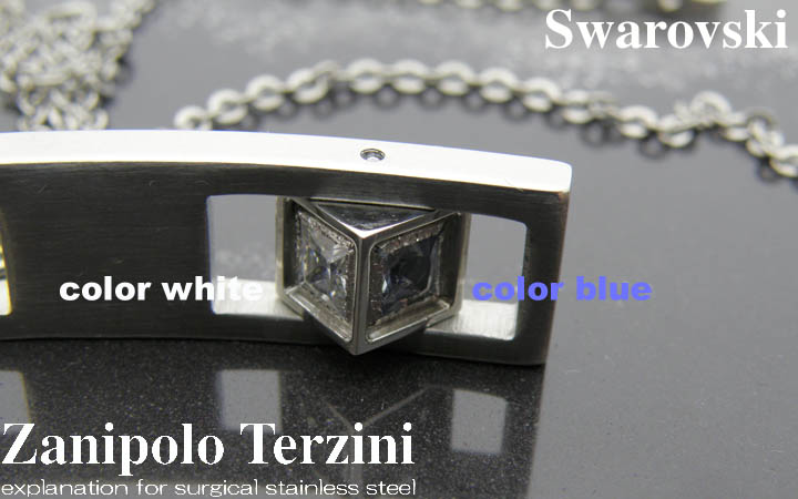 スワロフスキーの入ったサイコロが回るデザインのトップです。 ホワイト、ブラック、ブルー、スカイブルーの4色のスワロフスキー、それぞれ違った雰囲気を造りだしてくれます。 ■サイズ:H=31.0mm x W=11.0mm     ■素材:サージカルステンレス、Swarovski     ■付属品:ステンレスチェーン、Zanipolo Terziniオリジナルポーチ