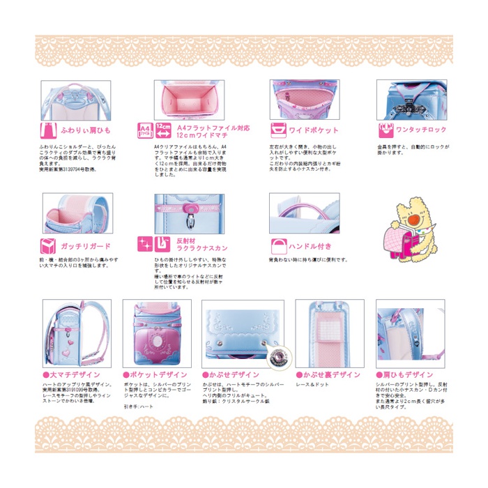 소녀 모델의 디자인은 하트가 가득의 귀여운 란도세루(초등학생이 어깨에 매는 가방).싸이드나 커버,견끈에는 프릴과 자수가 충분히.중을 열면 하트무늬와 리본의 넥크리스무늬가 디자인.
