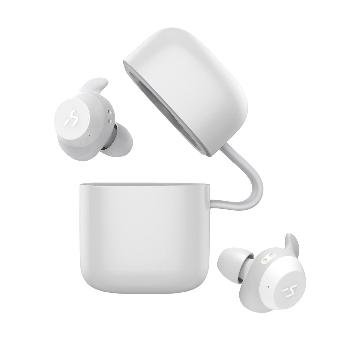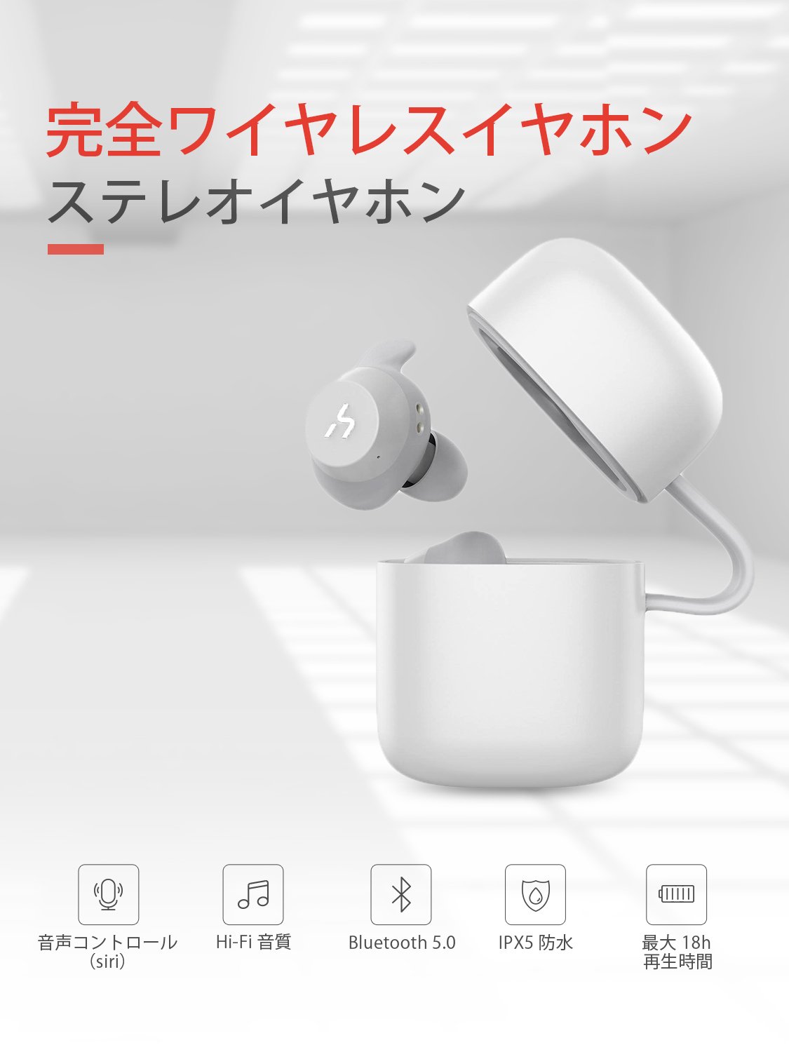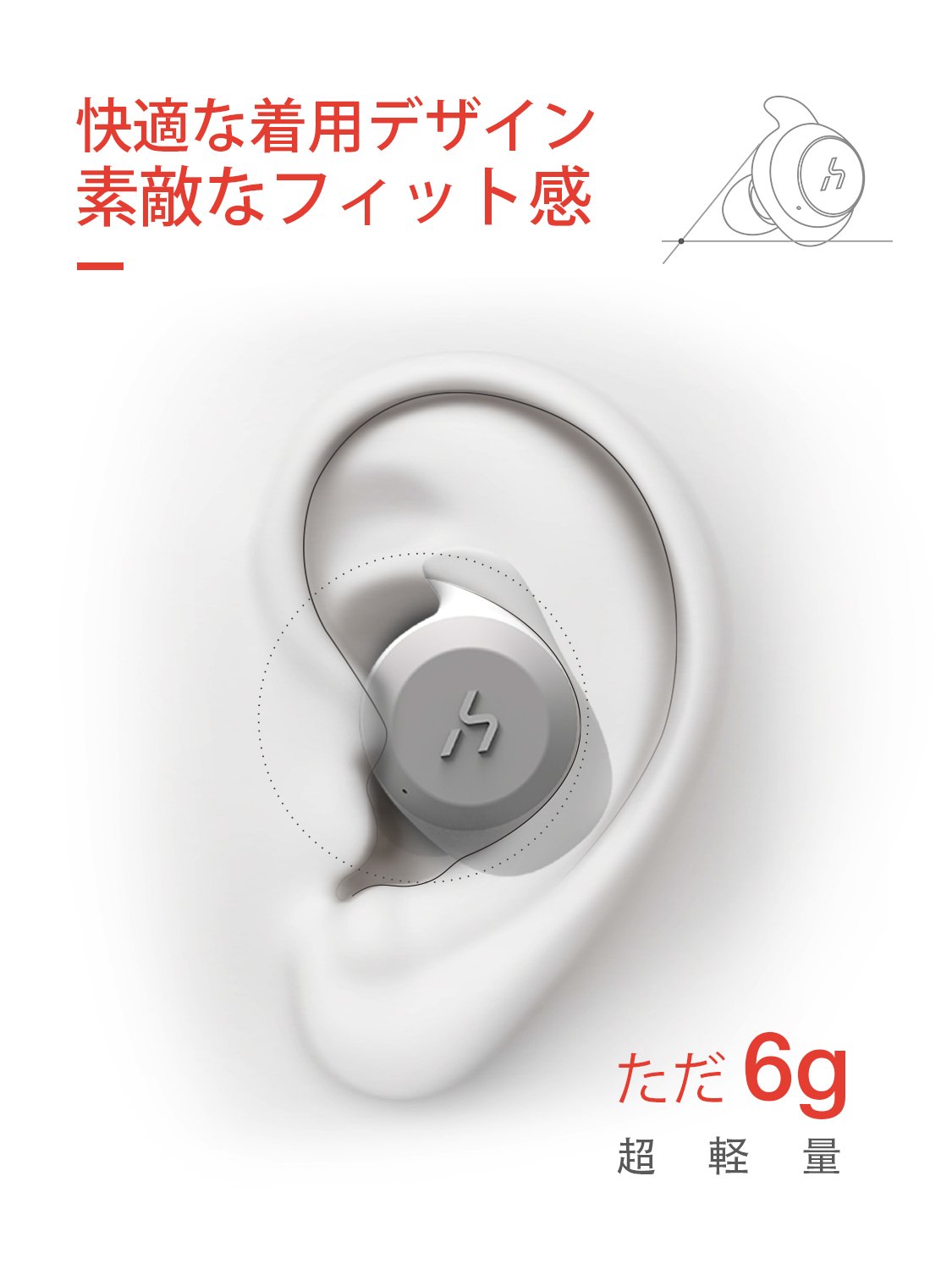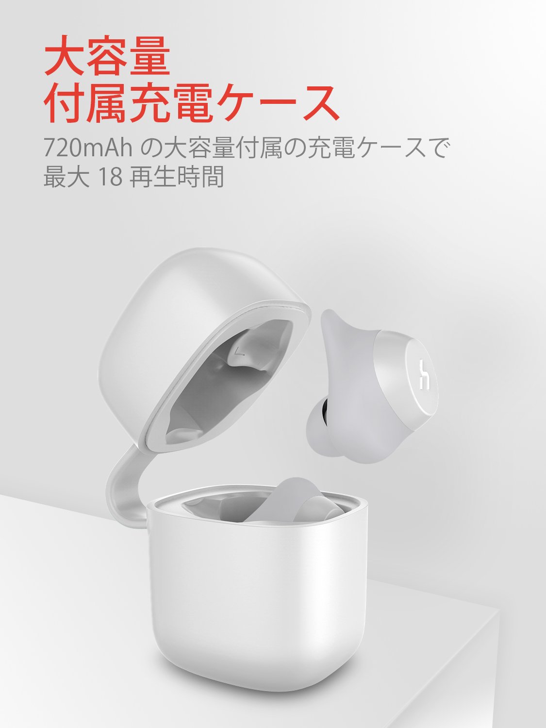 【エルゴノミクスフィット】人間工学に基いたスポーツデザイン。耳の上部にフィットする柔らかなフックを装着しており、イヤホンを耳にしっかり固定できます。日常での使用はもちろん、ランニングやジムでのワークアウト、ヨガなどの運動時、また運転や仕事する際も外れることがありません。最大18時間の使用時間:イヤホン本体がフル充電状態で、最大3.5時間の音楽再生が可能です。付属の充電ケースを合わせて使えば、最大18時間使用することができます(※再生可能時間は、音量、再生する内容、使用環境によって異なります)。