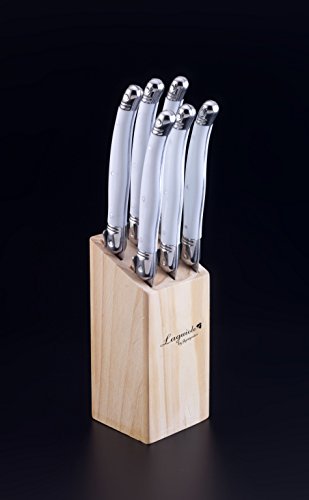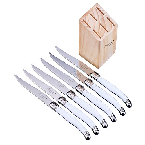 FlyingColors Laguiole Steak Knife Set. Wood Block, White Color Handle, 6 Pieces