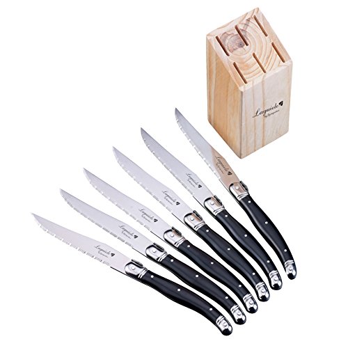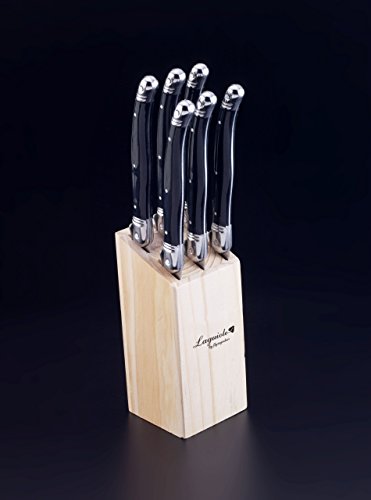FlyingColors Laguiole Steak Knife Set. Wood Block, Black Color Handle, 6 Pieces
