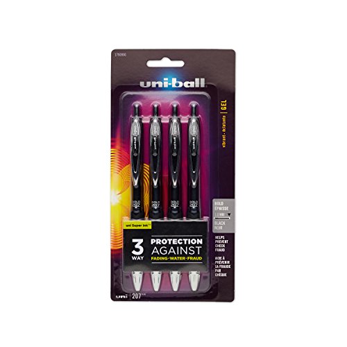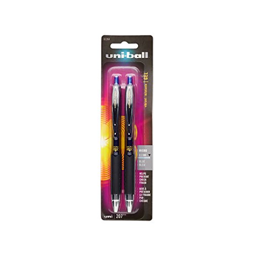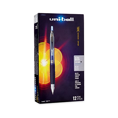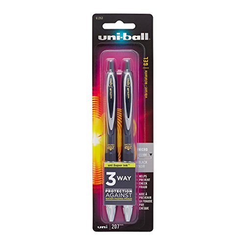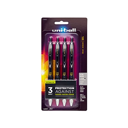 207 Retractable Gel Pens, Micro Point, Black Ink, Pack of 12. Uni Super ink is specially formulated to become trapped in paper, helping prevent criminal check washing and other document alteration. Textured grip provides superior writing comfort and control making this pen truly a pleasure to write with. Stylish metallic accents with a high-quality finish. Archival-quality, acid-free ink is quick-drying and fade- and water-resistant. Stainless steel, retractable tip for added convenience. 1.16 inches long by 3.36 inches wide by 6 inches high. 0.36 pounds. UPC for this product is: 70530612554 Related search terms for this product include: uni ball, uni-ball, retractable pen, gel pen, ink pen.