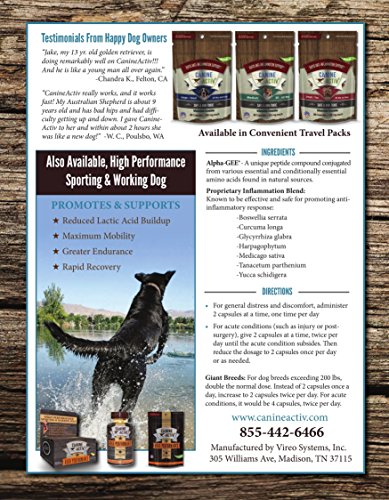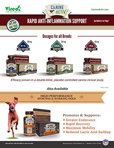 GUARANTEED FOR ANY BREED-Available in 3 variations, CanineActiv is compatible with all dogs-Small Breeds (under 25 lbs.) Medium Breeds (25-65 lbs.) and Large/Giant Breeds (65+ lbs.) RELIEF BREAKTHROUGH - Vireo Systems, Inc., manufacturer of CaninActiv also developed AminoActiv®, an Alpha-GEE supplement for humans that is a safe alternative to traditional pain relief.