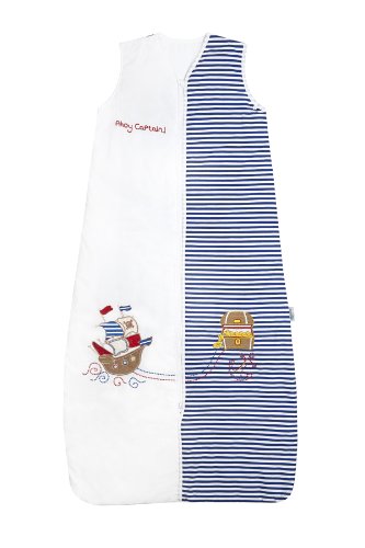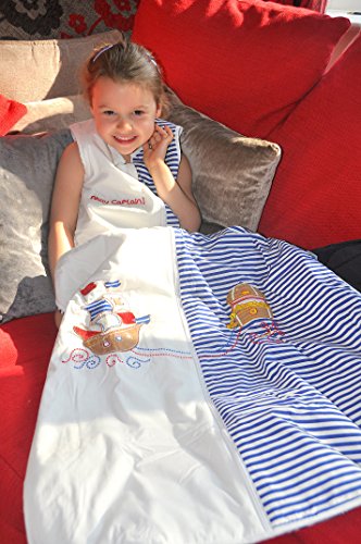 Feature : Premium quality sleep sack wearable blanket made from 100% cotton - ensuring your child has a peaceful and safe night's sleep, ideal for camping and sleep overs / Beautiful kids sleep sack for boys made from white/blue striped cotton with pirate ship embroidery / Light weight summer sleep sack, approx. 0.5 tog, unpadded, perfect for hot summer days and room temperatures above 75 F° / Size XXL: 6-10 years - suitable from 46-55 in / Made of 100% cotton, no padding, easy care - machine wash at 100 F° and low heat tumble dry