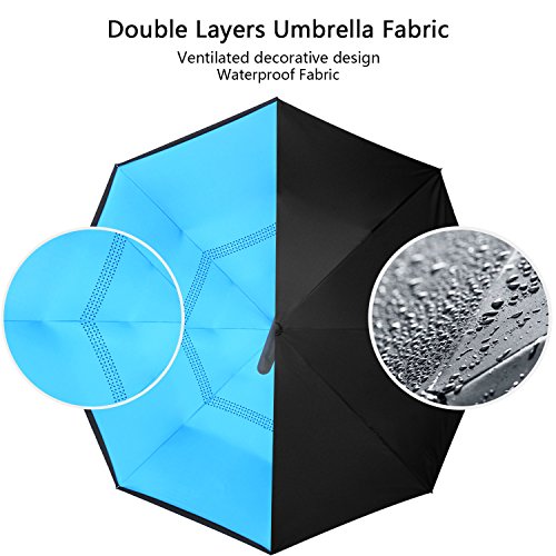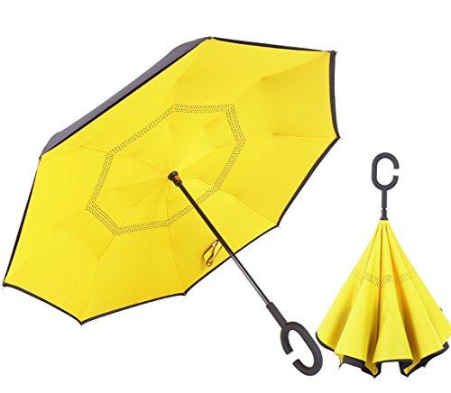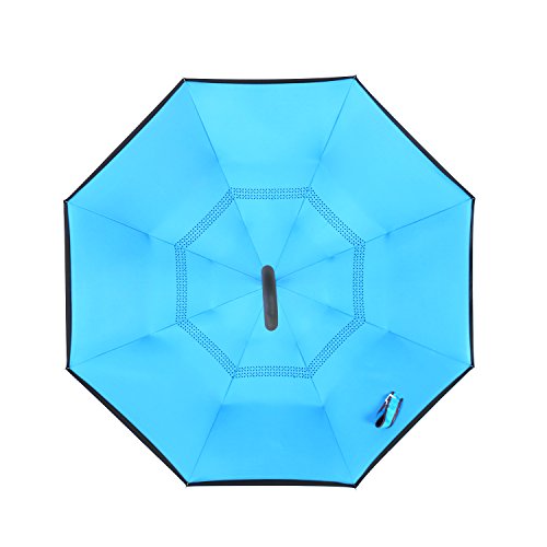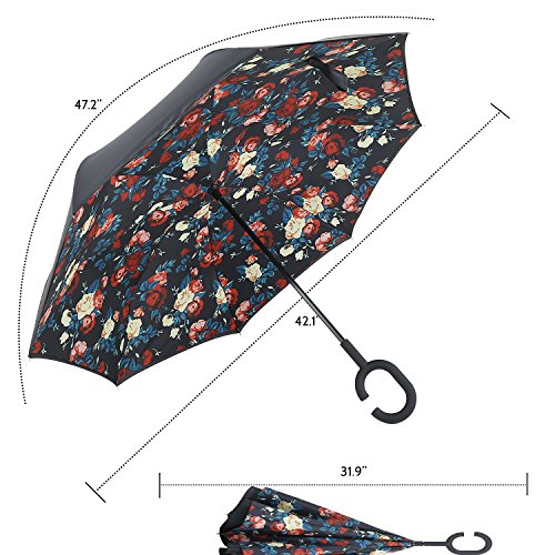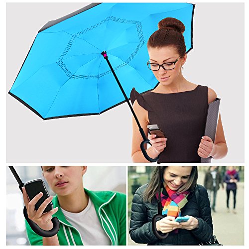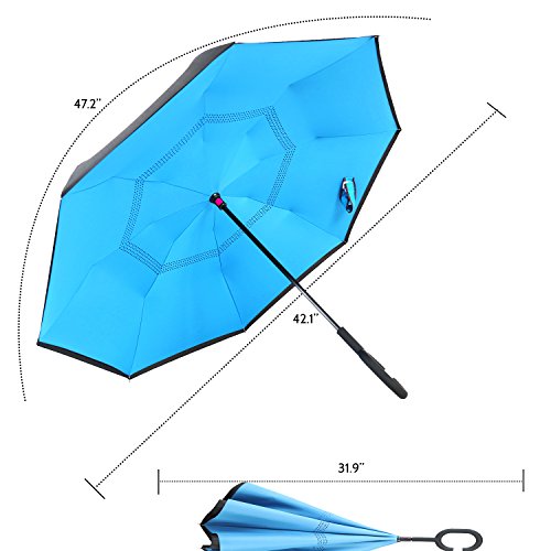 -. Feature : Inverted Design- You Can Open This Inverted Umbrella As You Open The Door And Not Get Wet, And When You Close The Reverse Umbrella, Getting Back In The Car, The Water Stays Inside Of The Umbrella And Doesn'T Get The Car Floor Wet. / Double Layer-Windproof And Waterproof,UV Protection,Perfect For Rainy Day Or Sunny Day. / Hands Free-An ergonomic C-shaped handgrip,it will leave your hands free for holding a baby or using a mobile if needed , The convenient button design make the inside out umbrella easy to operate. / Fiberglass RIBS: Solidly constructed by fiberglass, the ribs are unbreakable and can withstand high winds / Carbon Fiber Shaft: Complicated processing significantly enhances the overall robustness; repeated opening and closing tests ensure long term reliability