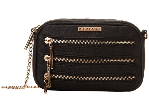 While you love your everyday tote, you don't love the idea of hauling it around with you on a night out. Sometimes you need a bag that's a little more manageable--something that's just big enough for the essentials and won't get in the way. This Rampage Zipper Chain Strap Cross-Body Bag is a fabulous choice for day or night. It's made from textured faux leather and features funky metallic hardware accents, including cool zippers and a chain strap for a rock n' roll look. It's perfect for a day of shopping or a night of dancing, and everything in between! Made of textured synthetic leather Top zip closure Single chain cross-body strap Exterior boasts zipper embellishments--1 front zip pocket and 2 faux pockets Front brand logo detail Fully lined polyester interior Interior compartment with back wall zip pocket Approx measures: 7.5" W x 5" H x 2" D Strap measures 50" L; 24" drop