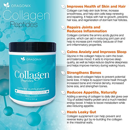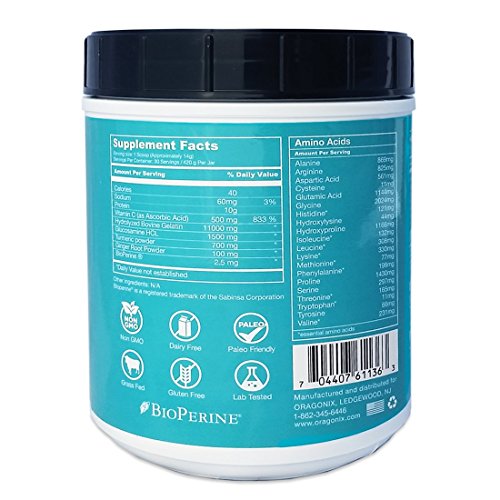 -. Feature : SPECIALLY BLENDED: Oragonix Collagen peptide is specifically blended for maximum results, we've combined 100% grass fed collagen with vitamin C, Ginger, Turmeric, Glucosamine and black pepper. You get optimal support for Hair and nails, Bones, Joints, tendons, ligaments, muscles and more. / NOURISH ®ENERATE: Collagen helps support regeneration and acts like a repair treatment from within. Nourish every cell in the Body, Collagen is used in some way by every system in the body. Oragonix collagen is designed to have maximum assimilation and to get superior results. / ANTI INFLAMATORY: This collagen has anti-inflammatory ingredients Like Turmeric, Ginger, Black pepper, and Glucosamine. Keeping inflammation down is an important factor for getting positive results / CLEAN INGREDIENTS: All ingredients are quality tested, no fillers, coloring, chemicals or binding agents, Non GMO, Gluten free, Dairy Free. / BE SATISFIED with the shampoo or get money back. Consider this a risk-free purchase. If you are ready to get Collagen hit the Add to Cart button!