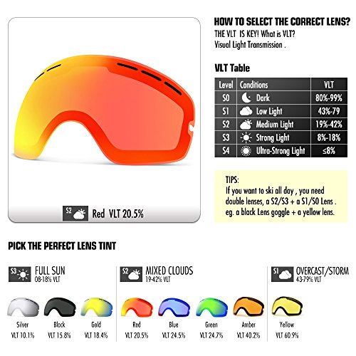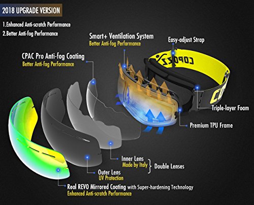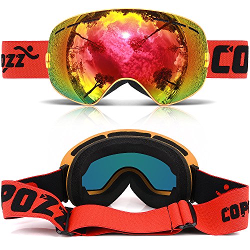 BrandCOPOZZ Ski Goggles perfectly attach onto face and windproof. The lens is made of imported anti-fog lens which through strengthening and coating treatment,surface with anti-scratch,anti-shock and wear-resistant,100% anti UV, protect your eyes well when skiing,snowboarding and other snow sports.Clear vision at day & night in all weather condition: Different lens VLTs offer great panoramic vision and clean sight for all the way on the slope.The GOG-201 snow goggles come with adjustable extra-long head strap which compatible with helmet and different head size from teenager to adult. Tech Specs:- Lens type: Spherical - Detachable Lens:Yes - Detachable strap:Yes - Frame: TPU - Ventilation: Two-way channel - Helmet Compatible: Yes - Face Size: Small to Medium - UV400 Protection Coating: Yes - Anti-fog Coating: YesFeatures:- Embeddable Myopic Lens - Double-lens - Anti-ultraviolet radiation - Anti-impact - Anti-fog - Dual-clip - Breathable Foam Design - Three layers of Foam - Colorful LensFriendly TipsPlease do not use finger or rough cloth to wipe and clean the lens as they will either stain or scratch the lens.Please keep the goggle in the pouch or box instead of facing on the ground or desk.Please do not use mascara or other oily substance in case lens gets dirty. Please air-dry the goggles after every snow sport e.g. skiing, snowboarding and etc.Please do not wipe the inner lens which will invalidating anti-fog function. QA Q:Can I wear it with glasses? A:Yes. The goggle is fits for medium-to-small size glass. Q:Want to use the ski goggles on night ? A: You need to buy a extra lens which the VLT is 54%, and you can find it in this link.Any items with 1 year warranty from COPOZZ Official Store purchasedFeature