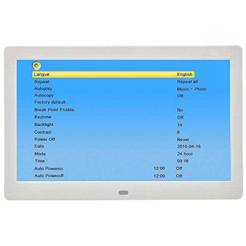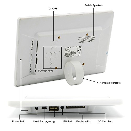 -. Feature : 10.1 in.wide viewing angles,1024x600 High Resolution IPS ,(16:9 Aspect Ratio) with low consumption LED Backlit Display.Comes with an infrared remote control / Ultimate photo viewing experience:Photo &Music&txt.document&HD Video Playback via USB/SD/SDHC/MS Card;Multiple Photo/Video/Audio format compatibility,Auto/Manual slideshow feature on photos display;14 styles of slideshows / Image rotate function;Interpose background music while displaying photos;Multiple language selection;Support headpone without mic / Preview image function;Autoplay setting: instantly display what you assigned once pling SD card/USB devices;Auto On/Off Timer / Alarm Clock/Calendar/ClockFunction(4 MODES), Built-in Speakers,Let your special moments last forever;The perfect gift for a loved one; Full One Year Warranty