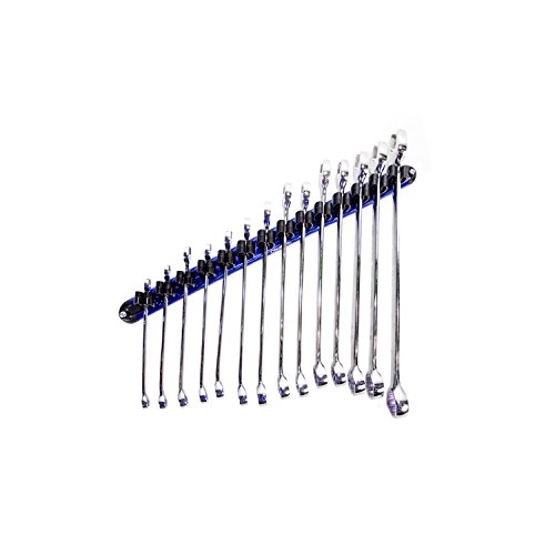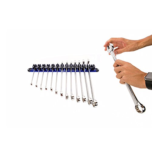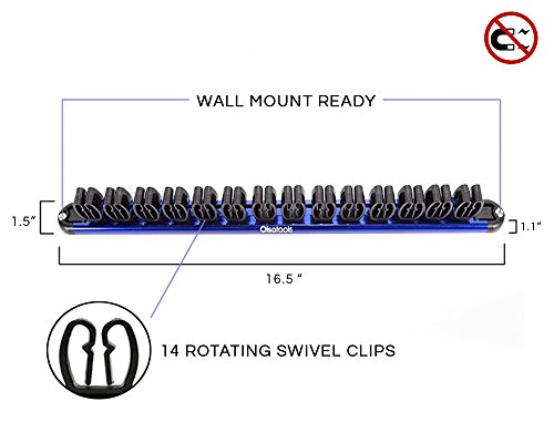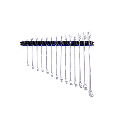 Olsa Tools | Wall Mount Wrench Organizer with Rotating Clips | Blue Anodized Aluminum + Black Clips | Premium Quality Wrench Holder | 14 Wrenches Fit Rack