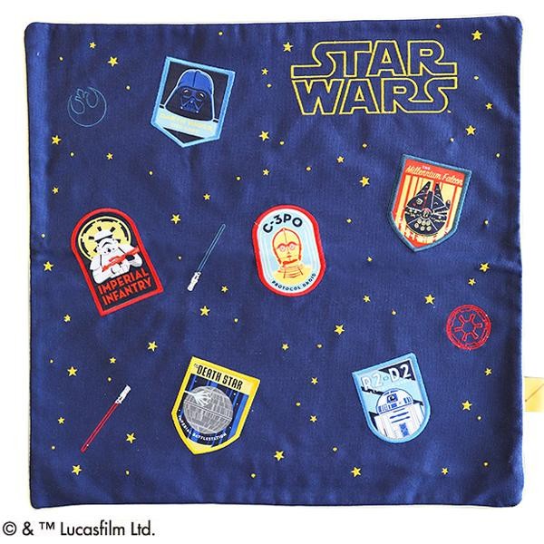 スターウォーズの世界観がカラフルなワッペンでポップに表現されたクッションカバーです。