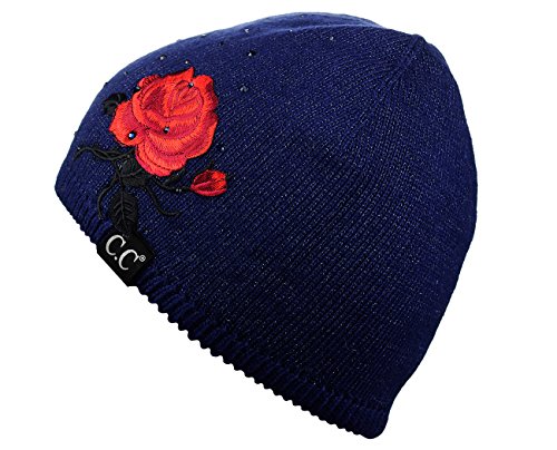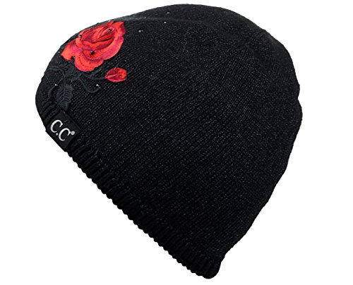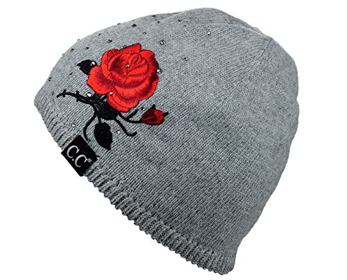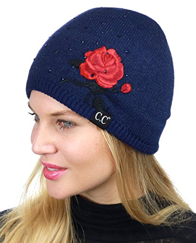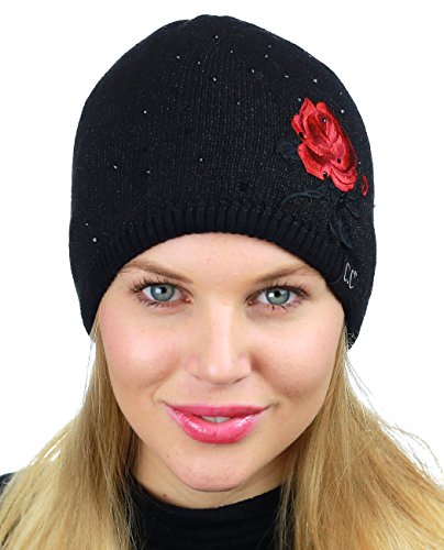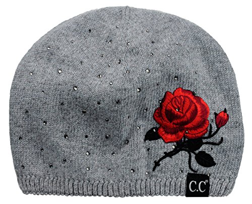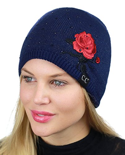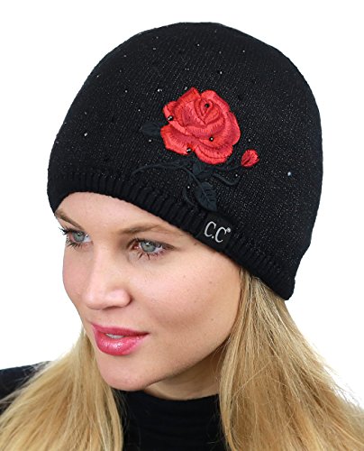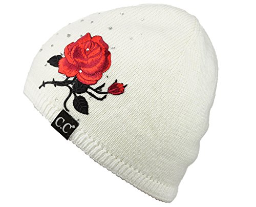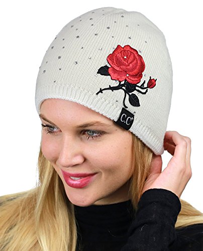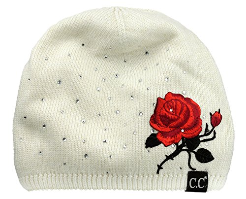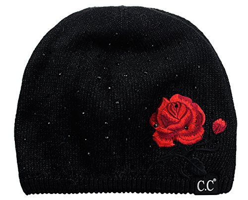 C.C Rhinestone Embellished Embroidered Rose Angora Skull Cap Beanie