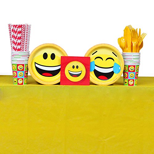- Emojions Party Supplies Pack Includes: Straws, Dessert Plates, Cups, Beverage Napkins, and Table Cover