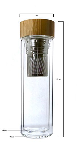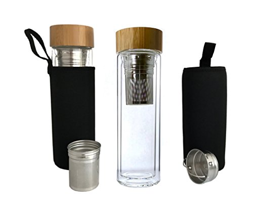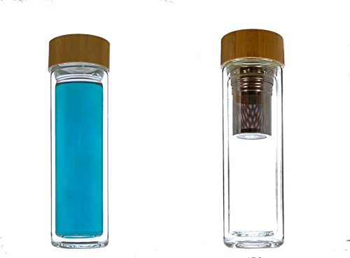When it comes to drinking containers, it has to be food safe without worry of toxic and odor. This stylish design glass bottle offer a safer and healthier way of drinking. Made of FDA approved BPA free Borosilicate glass with bamboo lid. Non Toxic! No Plastic at all ! The Borosilicate glass is: * Stronger and more durable than regular glass. * Temperature resistance, it keeps cold /hot drinks stay cold/hot longer. * Condensation resistant, it won't get wet on the exterior wall. * The double-wall provides extra insulation to protect your fingers from getting burned or freeze when holding the bottle. This Borosilicate Glass Water Bottle has * 4mm thick bottle. * Two inches wide-mouth opening is easy to fill up and clean. * Food grade stainless steel infuser allow us to made tea or any drinks more flexible: (a) Connected the strainer basket and the infuser together to make loose leaf tea. (b) Use only the strainer for fruit, herb infusion. (c) Use it as a water bottle without the infuser. Plus, a neoprene sleeve to keep beverage temperature, also for safe and easy holding while on the go. ** Do not pass the fill line. **hand wash only, do not place the bottle and the lid in the dishwasher or microwaveFeature