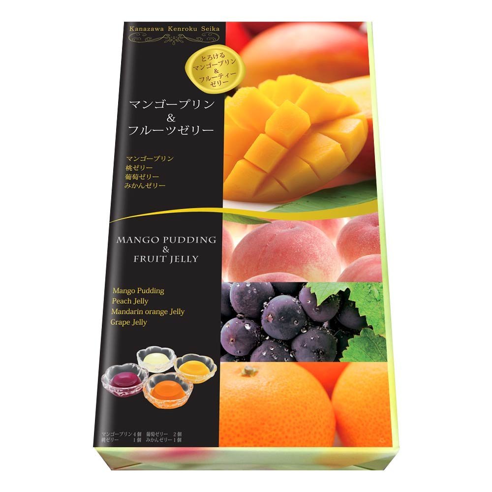 - 原材料:【マンゴープリン】糖類(果糖ブドウ糖液糖、砂糖)、植物性クリーム(加工油脂、乳たん白、発酵乳)、マンゴーピューレ、ゲル化剤(増粘多糖類、加工でん粉)、酸味料、香料、pH調整剤、着色料(紅花黄、カロテノイド、アカキャベツ、酵素処理ルチン)、乳化剤、(原材料の一部に大豆を含む)【葡萄ゼリー】糖類(果糖ブドウ糖液糖、砂糖)、グレープ果汁、植物性クリーム(加工油脂、乳たん白、発酵乳)、ゲル化剤(増粘多糖類)、酸味料、pH調整剤、香料、着色料(アカキャベツ、クチナシ、赤ダイコン、酵素処理ルチン)、乳化剤、(原材料の一部に大豆を含む)【桃ゼリー】糖類(果糖ブドウ糖液糖、砂糖)、もも果汁、植物性クリーム(加工油脂、乳たん白、発酵乳)、ゲル化剤(増粘多糖類)、酸味料、pH調整剤、香料、着色料(アカキャベツ、紅花黄、酵素処理ルチン)、乳化剤、(原材料の一部に大豆を含む)【みかんゼリー】糖類(果糖ブドウ糖液糖、砂糖)、果汁(オレンジ、みかん)、植物性クリーム(加工油脂、乳たん白、発酵乳)、ゲル化剤(増粘多糖類)、酸味料、pH調整剤、香料、着色料(紅花黄、アカキャベツ、カロテノイド、酵素処理ルチン)、乳化剤、(原材料の一部に大豆を含む)