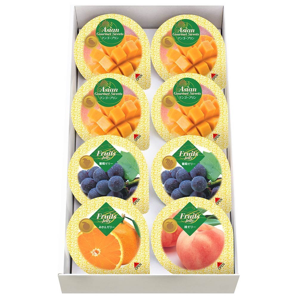 アルフォンソマンゴーピューレを使用し、トロピカルな味わいと喉ごしのよいなめらかなマンゴープリンと、みずみずしくぷるるんとした食感がお口いっぱいに広がる葡萄ゼリーと桃ゼリーとみかんゼリーの詰合せです。