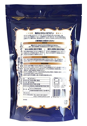 毎日とりたいゼラチン! ゼラチンの素となるコラーゲンは、体を形成するたんぱく質の一種。ゼラチンは無脂肪でヘルシーな動物性蛋白質です。本商品は、中でも抜群の透明度を持ち冷菓から料理まで使える万能型ゼラチンです。ゼリー、ババロア、ムースなどにお使い下さい。