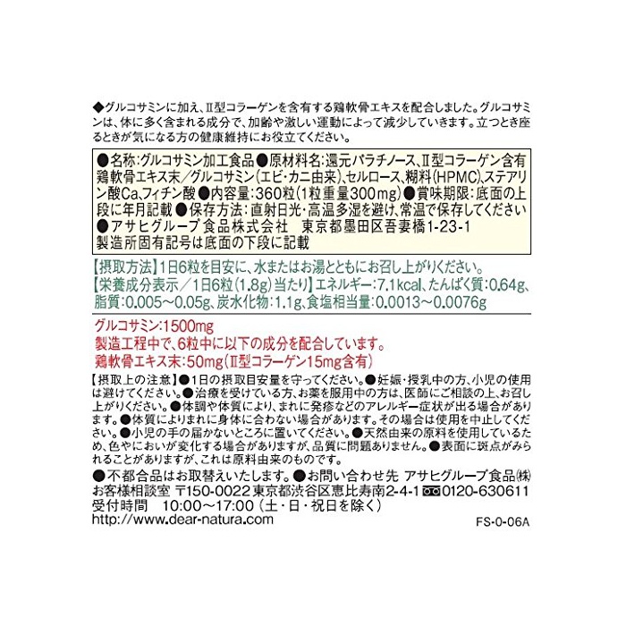 원재료 : II형 콜라겐 함유계 연골 엑기스,《구루코사민》(새우,게 유래)고, 셀룰로오스,스테아린산Ca,미립 산화 규소