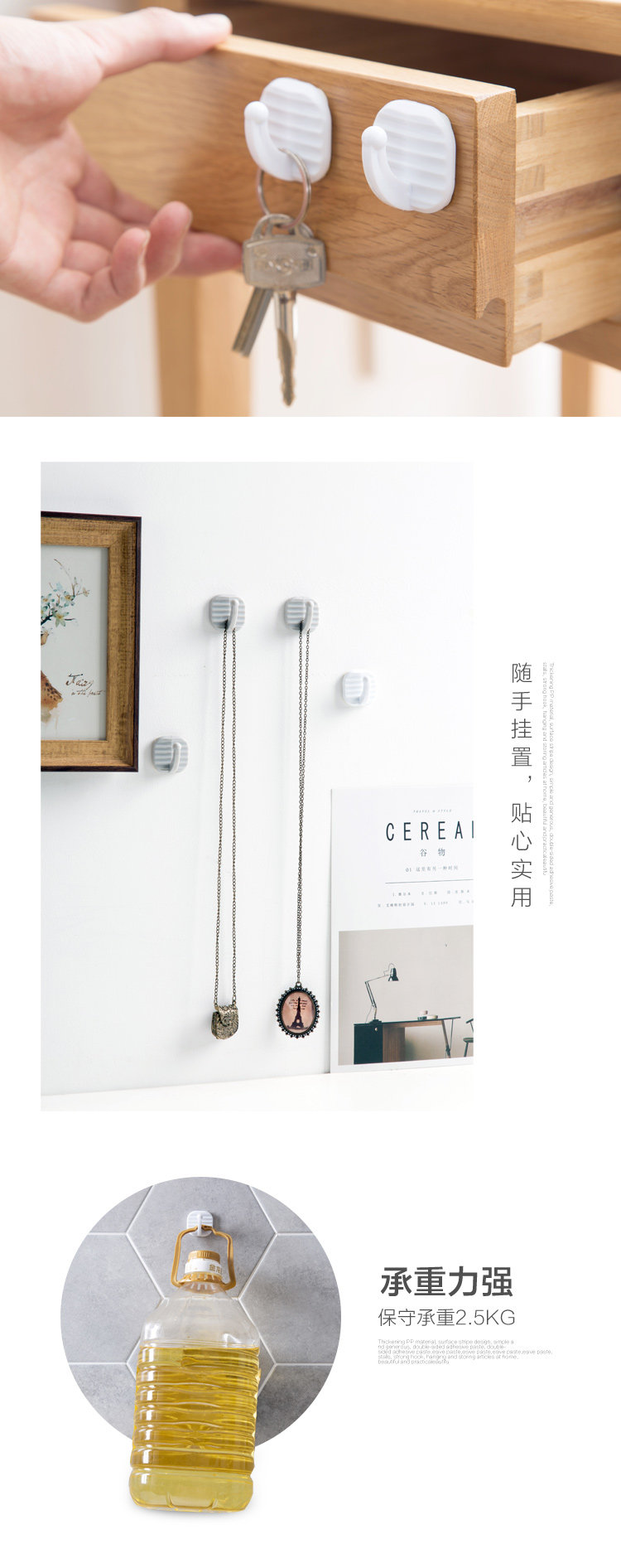 Summary: thick PP material, surface stripes design, simple and elegant, double-sided adhesive paste, no drilling, easy installation, 5 installed, strong sticky hook, hanging items at home, beautiful and practical