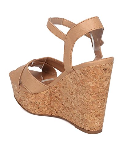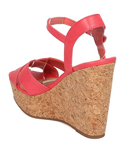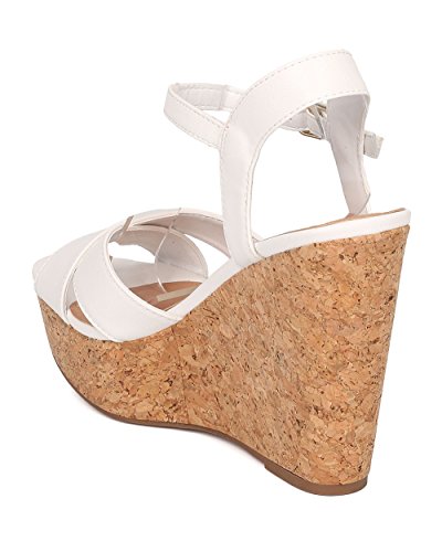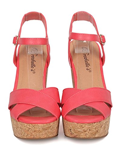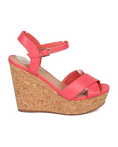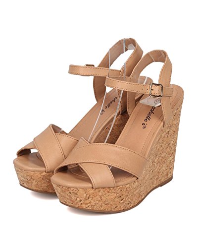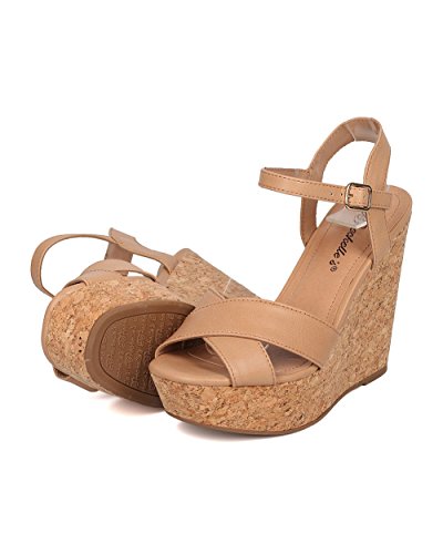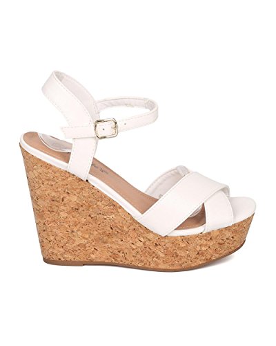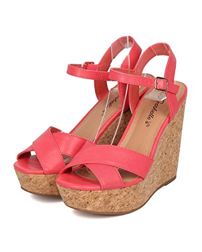 Product Description These leatherette sandals are made with a peep toe, cross bands at vamp and faux cork platform wedge heel. Also made with an ankle strap with adjustable buckle closure. 0