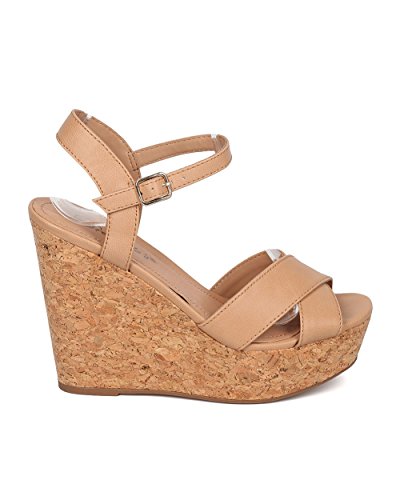 Women Faux Cork Platform Wedge Sandal - Ankle Strap Wedge - Peep Toe Sandal - HK37 By Breckelles