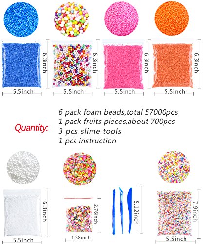 - 【PACKAGE INCLUDES】: 6 pack foam beads( 2 pack mixed color, 1 pack white, 1 pack pink, 1 pack blue ,1 pack orange ), Size 0.1-0.35 inch, quantity: totally about 57000pcs, 15000 pcs small mixed color + 2000 pcs big mixed color + 4 x 10000 pcs solid color+700 pcs Fruits Flowers pieces