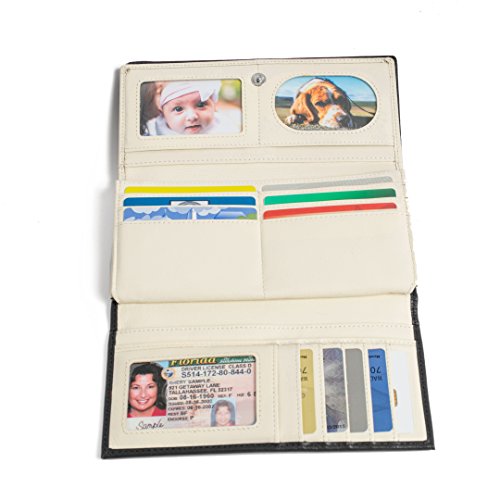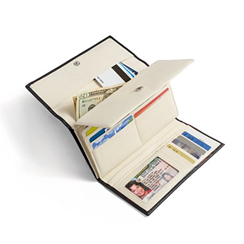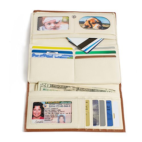 -. Feature : HUGE STORAGE! This genuine leather RFID wallet holds so much it almost defies the laws of physics! This wallet has two compartments - open one if you're paying with cash or check - open the other if paying by credit card. This mega wallet has a zippered change compartment, 11 credit card slots, 3 more clear ID slots, 8 additional pockets - 2 of which are gusseted, which run the full length of the wallet. That's a total of 23 compartments! / Pockets are large enough to hold a checkbook as well as your passport. Stay Organized. With so many sections and compartments, you'll have a place for everything, and everything in it's place. You can have all your store rewards cards with you when you need them. Carry your health card, insurance card, and auto club cards with you. No need to keep some cards at home; you'll have room for everything with this fashionable clutch. / GENUINE LEATHER. This RFID Wallet offers abundant functionality while remaining classically elegant. Made with the softest leather, this wallet looks and feels great, making you look and feel great too! / EVERY SLOT SHIELDED to protect your Credit Card, Debit Card, Enhanced Driver's License, Transit Card, Hotel Room Key, Passport Card, etc. transmitting at 13.56 Mhz and higher. Designed with top security in mind. As with all ID Stronghold wallets, every slot, ID window, billfold, and compartment is individually shielded, so your information is protected even when your wallet is fully open. This is not a feature found in most RFID wallets. / PERFECT GIFT! Each wallet comes with its own original ID Stronghold GIFT BOX so you can buy one for yourself, and one for a friend. Looking for something different? Just search for ID Stronghold at the top of Amazon to find all of our styles. Product Dimensions: 7.5 x 4.25 x 1.25 inches • Product Weight: 8.27 ounces.