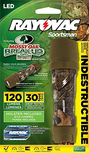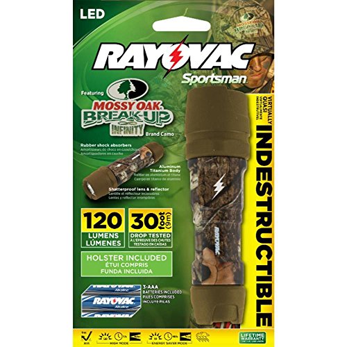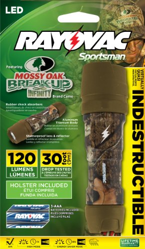 Studio : Rayovac Publisher : Rayovac Binding : Tools Home Improvement Product Description The OT3AAACAMO-B brings the toughness of RAYOVAC Indestructible and adds Mossy Oak Break-Up Infinity camouflage pattern. With an industry leading 30 foot ANSI FL1 drop test claim, this flashlight can virtually withstand any obstacle ranging from everyday use to the job site. By incorporating the Mossy Oak Break-Up Infinity RAYOVAC has combined the Indestructible with branded camouflage that is perfect for the outdoorsmen or everyday use. Shatterproof lens and reflector, aluminum-titanium body and rubber head and tail cap shock absorbers. 0