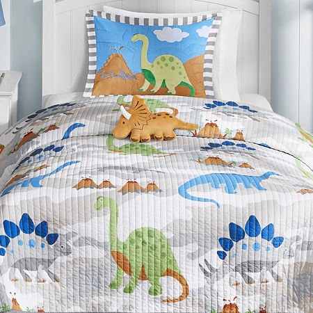 Take a walk into the Jurassic age with the little foot coverlet set. Erupting Volcanoes, Brontosaurus, stegosaurus and a mountainous backdrop provides a fun atmosphere for the bedroom.