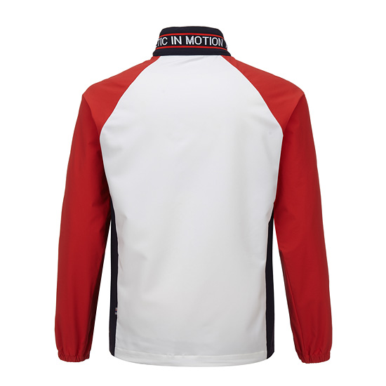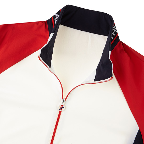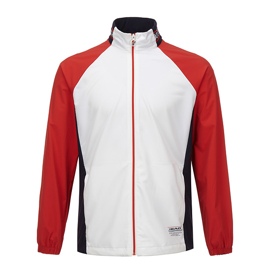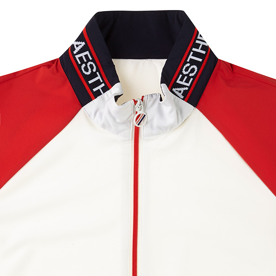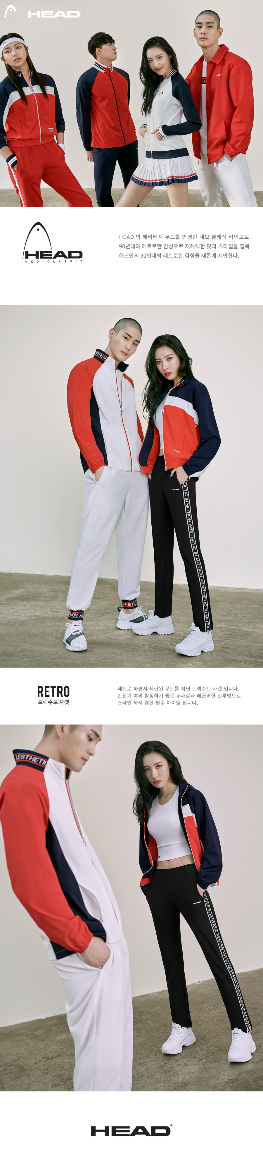 - 네크라인 레터링으로 레트로 무드를 강조한 남성 트랙수트 자켓.
