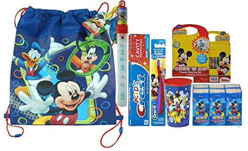 -. Feature : (1) Mickey Mouse Clubhouse Drawstring Backpack Travel Bag - Resuable, Light Weight & Convienant! 11" x 14" / (1) Disney Mickey Mouse Clubhouse Flashing Light Stick / (1) Oral-B Pro-Health Mickey Mouse Soft Manual Toothbrush. Assorted colors. (1) Mickey Mouse 16 oz Plastic Mouthwash Rinse Cup. (1) Crest Kids Cavity Protection Sparkle Fun Toothpaste, 2.7-oz. Tube / (1) Disney Mickey Mouse Pocket Tissues 6pk / (1) Mickey Mouse Activity Pad- Coloring Pages, Activities, Games & More!